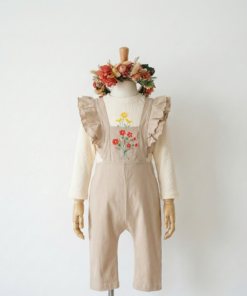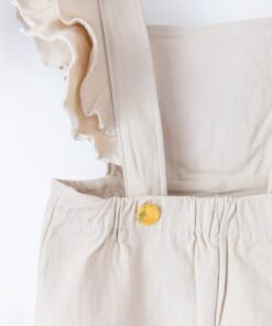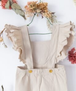 Su diseño presenta un tono beige que se destaca en cualquier look. Las correas regulables con doble altura de botón permiten adaptarlo al crecimiento, y están adornadas con volados festoneados que aportan un aire romántico y vintage.