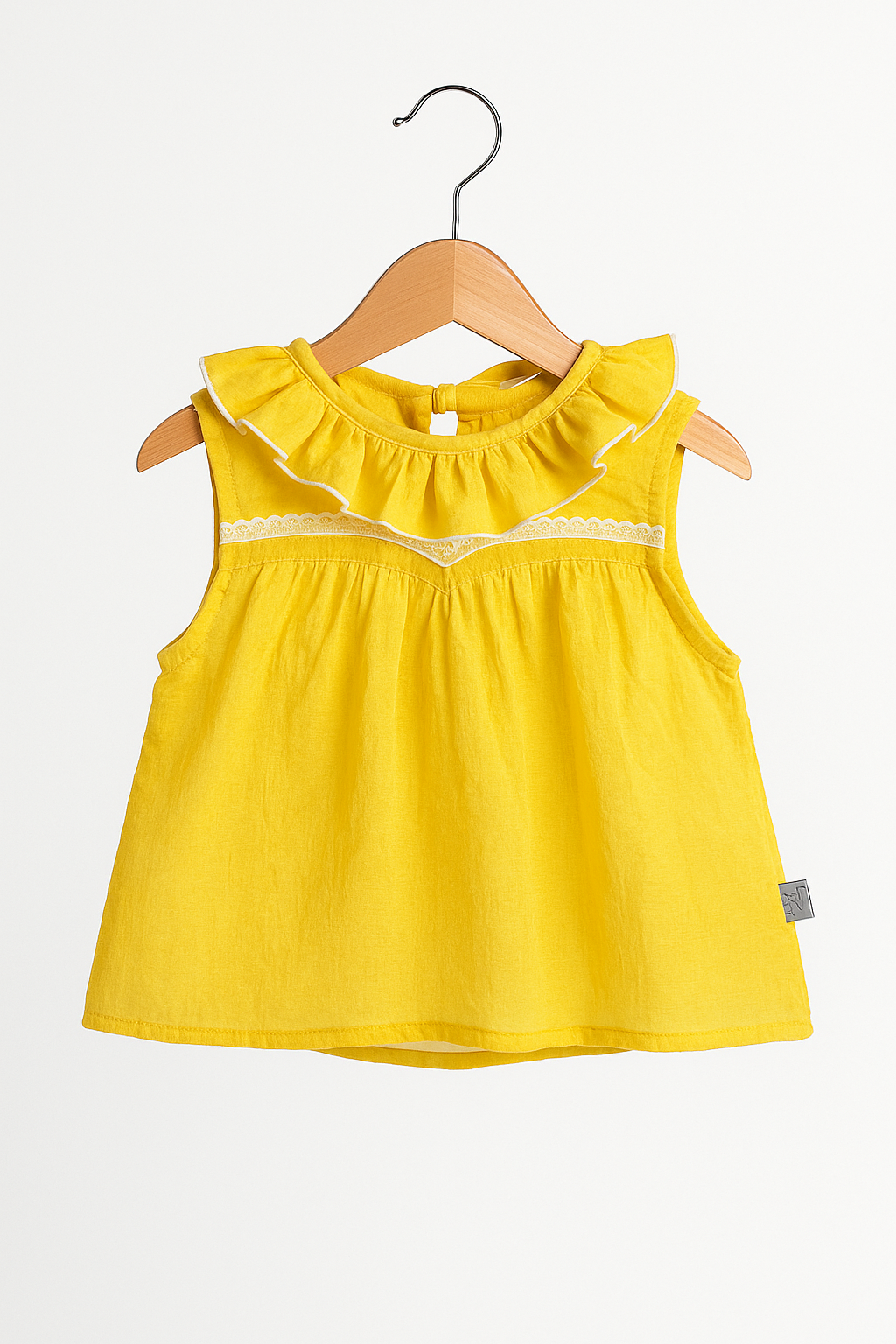 Su diseño destaca por el cuello con volado doble y las terminaciones en festones blancos, que realzan el trabajo manual y el carácter exclusivo de cada prenda. En la espalda, un lazo para atar permite ajustar la prenda con suavidad, asegurando comodidad sin perder elegancia.