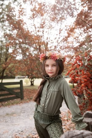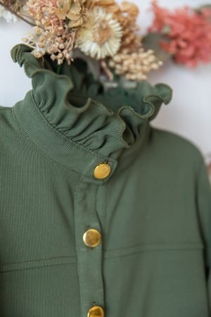Esta camisa de morley verde militar es un tributo al estilo vintage con un toque moderno. Su cuello Mao y los detalles en dorado le dan un aire sofisticado, mientras que el elástico en puños y el volado en el pecho aseguran comodidad para el día a día. Ideal para looks casuales o eventos especiales