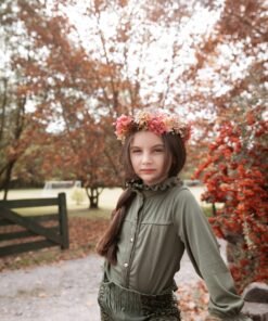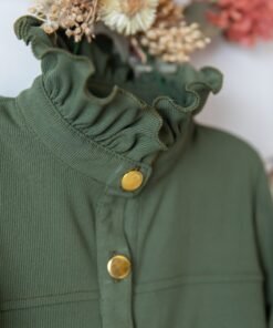 Esta camisa de morley verde militar es un tributo al estilo vintage con un toque moderno. Su cuello Mao y los detalles en dorado le dan un aire sofisticado, mientras que el elástico en puños y el volado en el pecho aseguran comodidad para el día a día. Ideal para looks casuales o eventos especiales