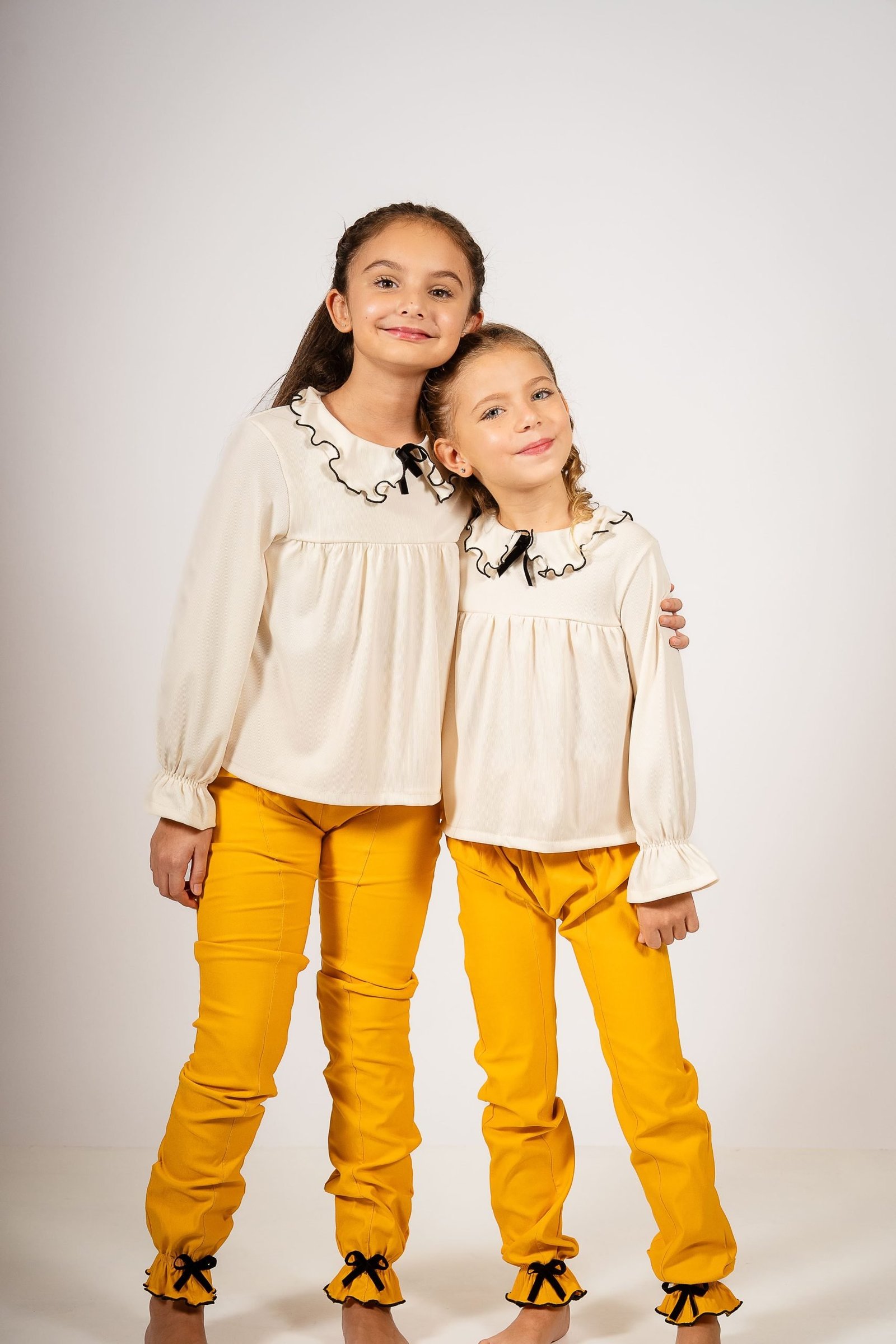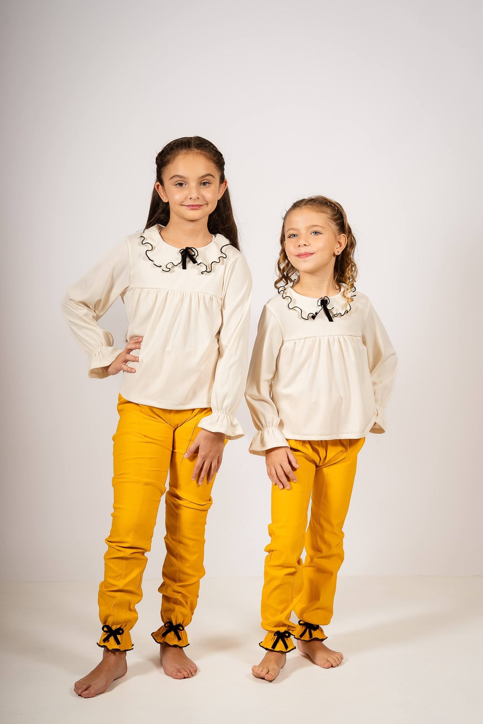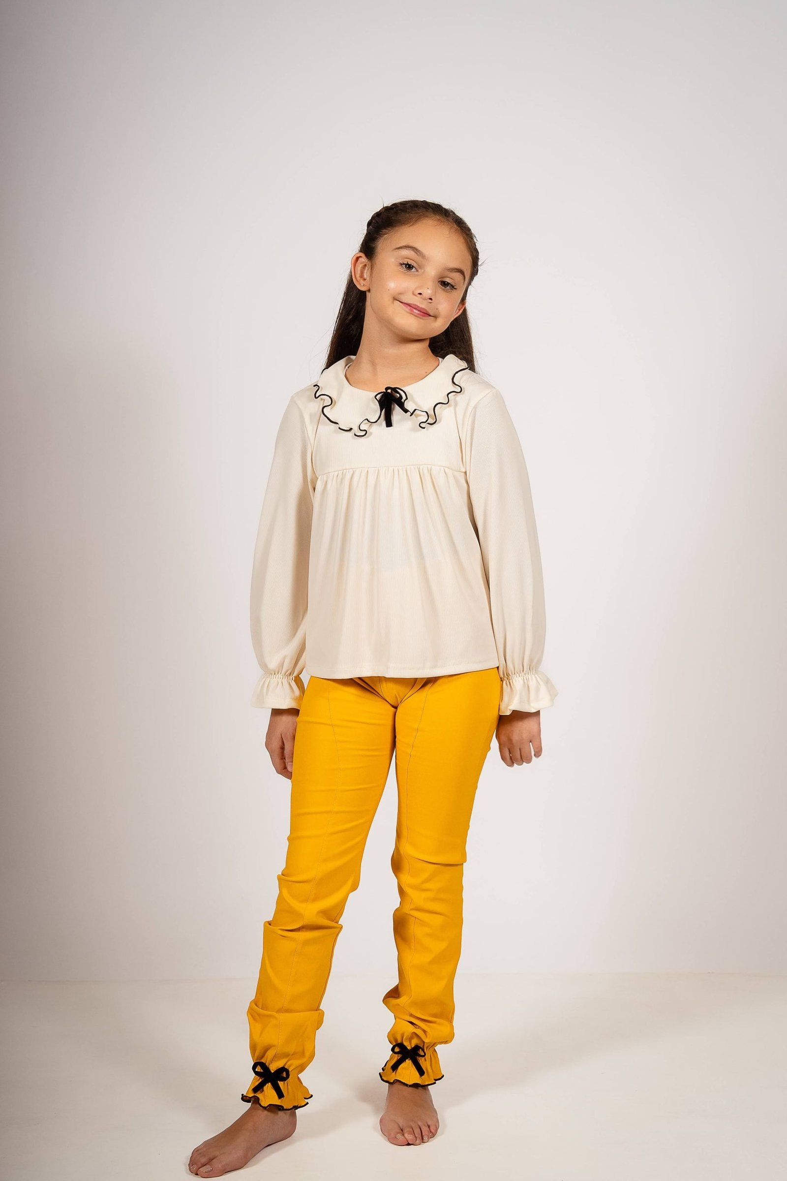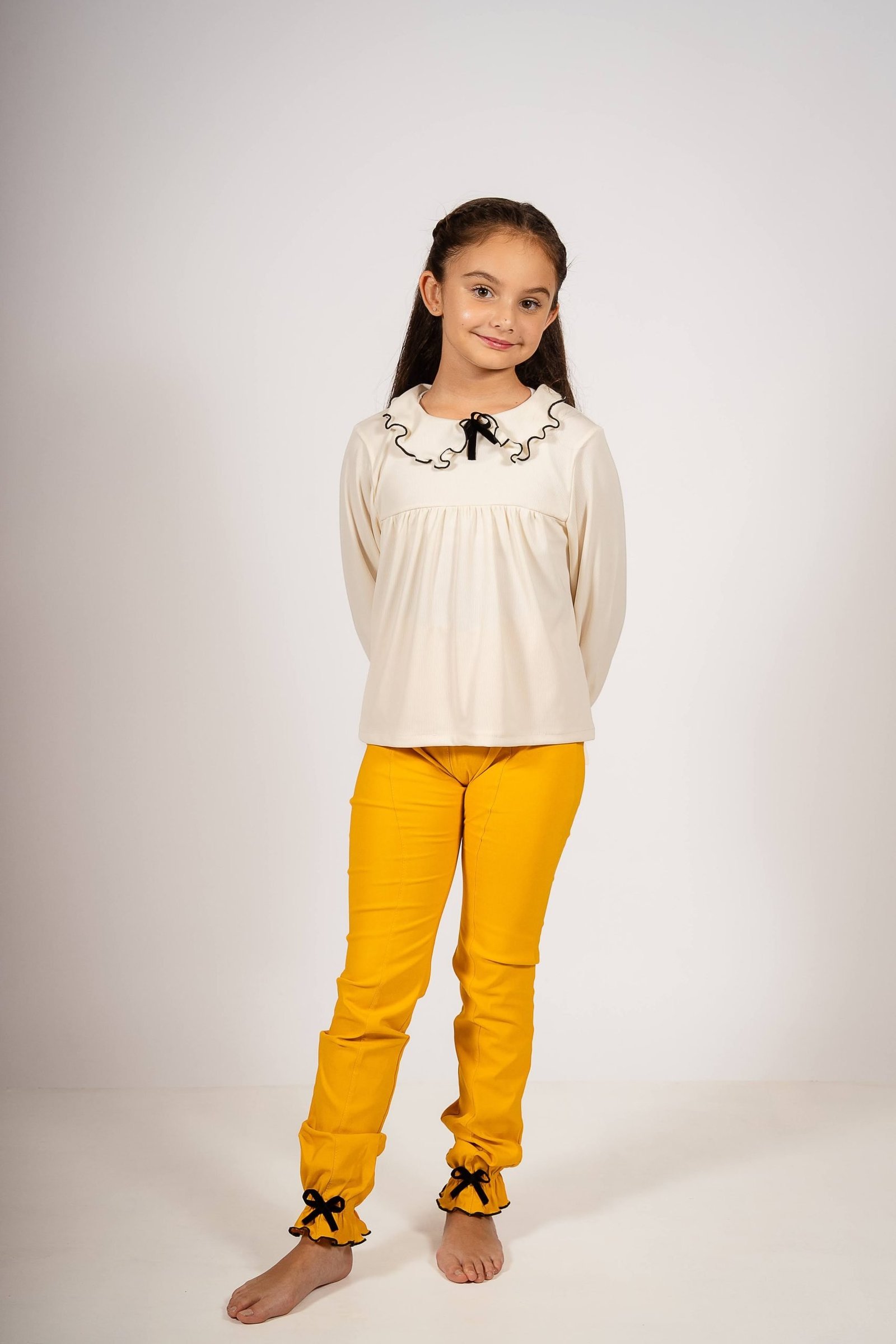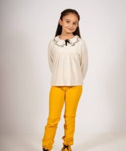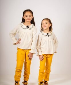 Conjunto Begoña de Blusa con Cuello Volado y Pantalón Mostaza con Moños – Look Otoñal para Niñas