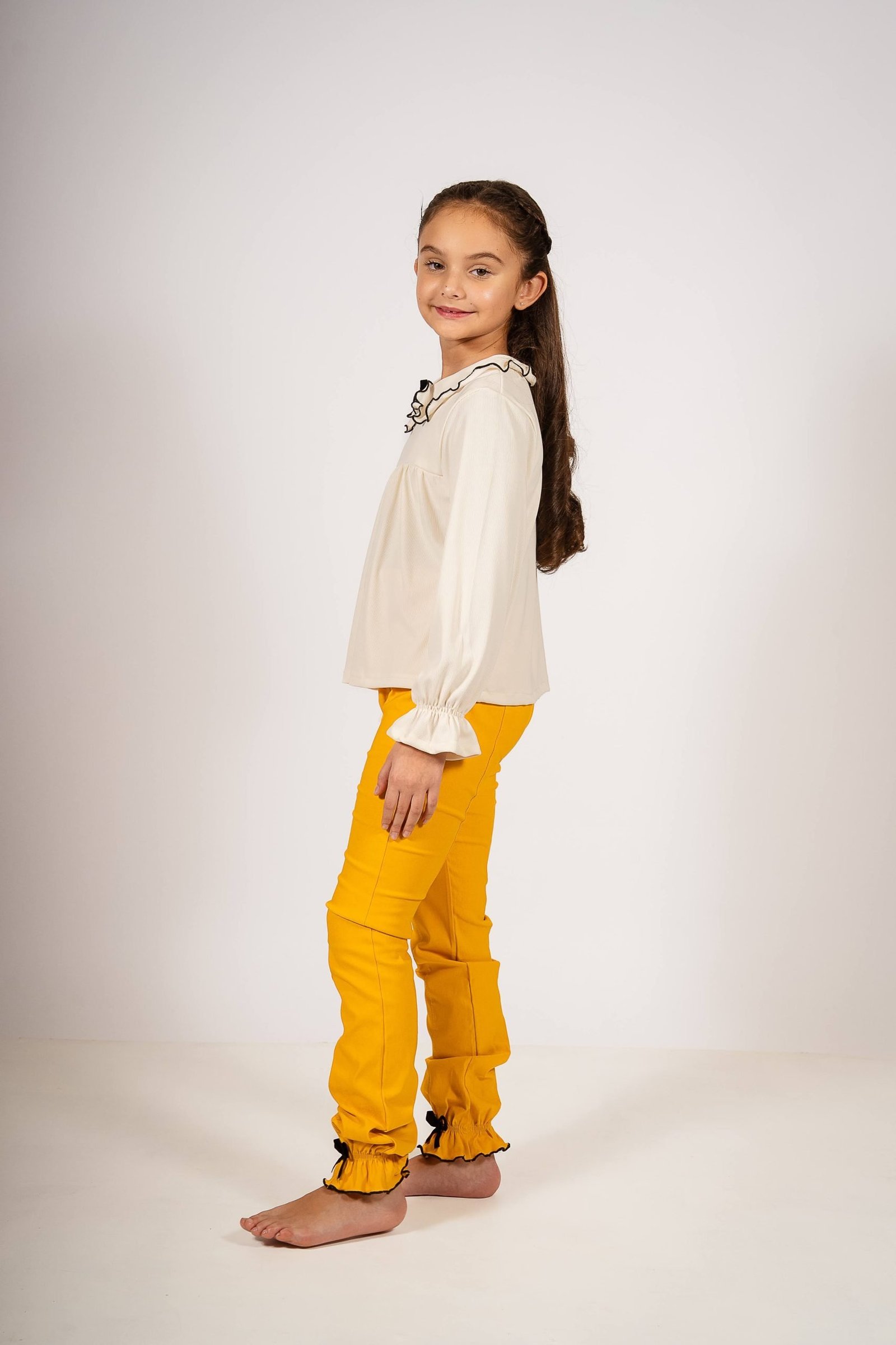 El look se completa con un pantalón mostaza con cintura elástica tipo “paper bag”, ideal para lograr un calce cómodo que acompaña el crecimiento. En los tobillos, dos moños negros sobre volados generan un contraste encantador y femenino, sumando un detalle de diseño único. El conjunto en su totalidad está pensado para destacar en cualquier ocasión, ya sea para una salida familiar, una sesión de fotos o una tarde especial.