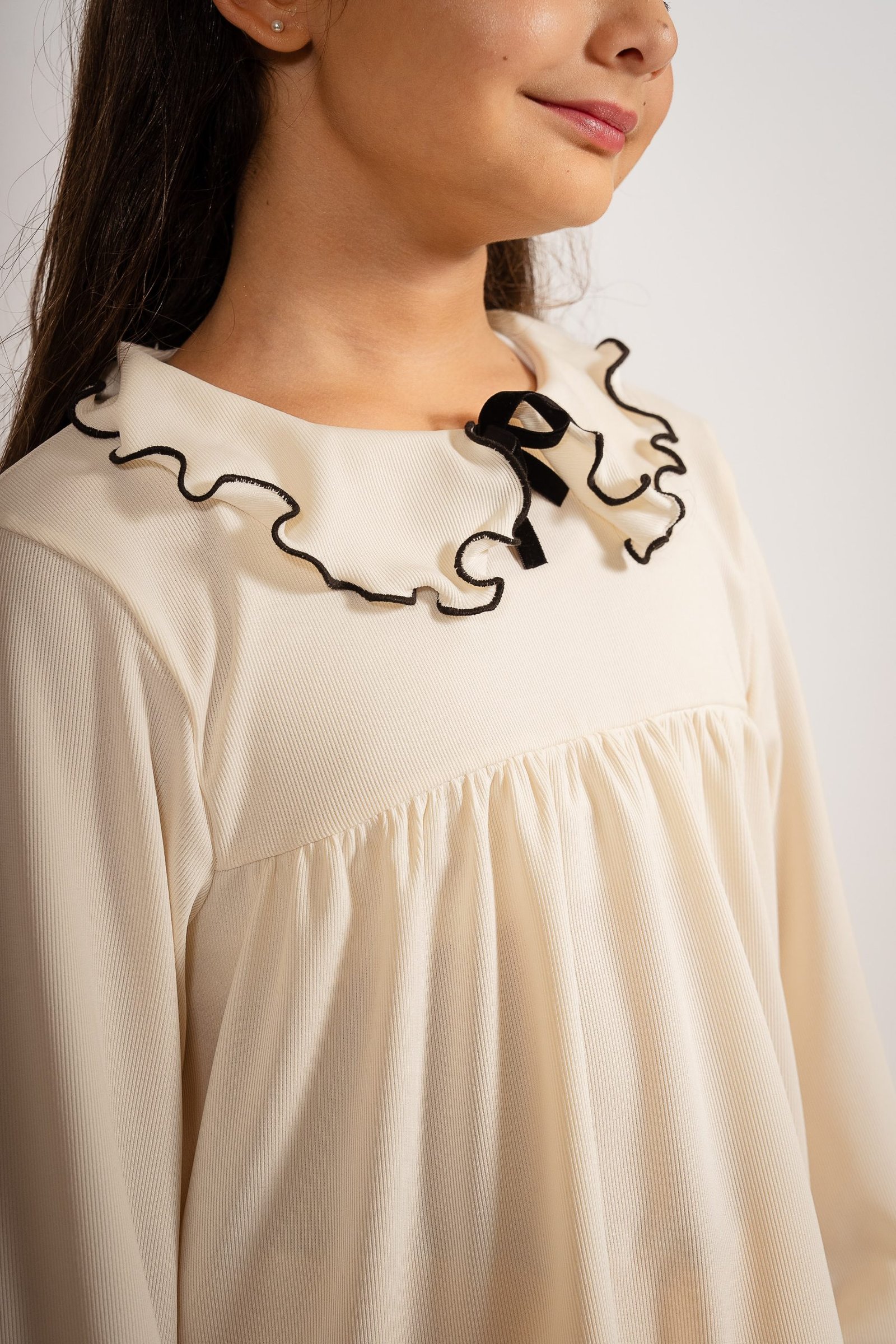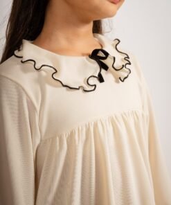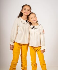 Este conjunto exclusivo de Begoña es la combinación ideal para vestir a las niñas con estilo, comodidad y un toque de distinción. Está compuesto por una blusa de manga larga en tono crema claro, con cuello volado rematado con un delicado vivo negro y moño de terciopelo al centro, que aporta elegancia y dulzura en partes iguales. La textura suave de la tela y el corte amplio permiten libertad de movimiento, siendo perfecta tanto para días especiales como para el uso cotidiano.