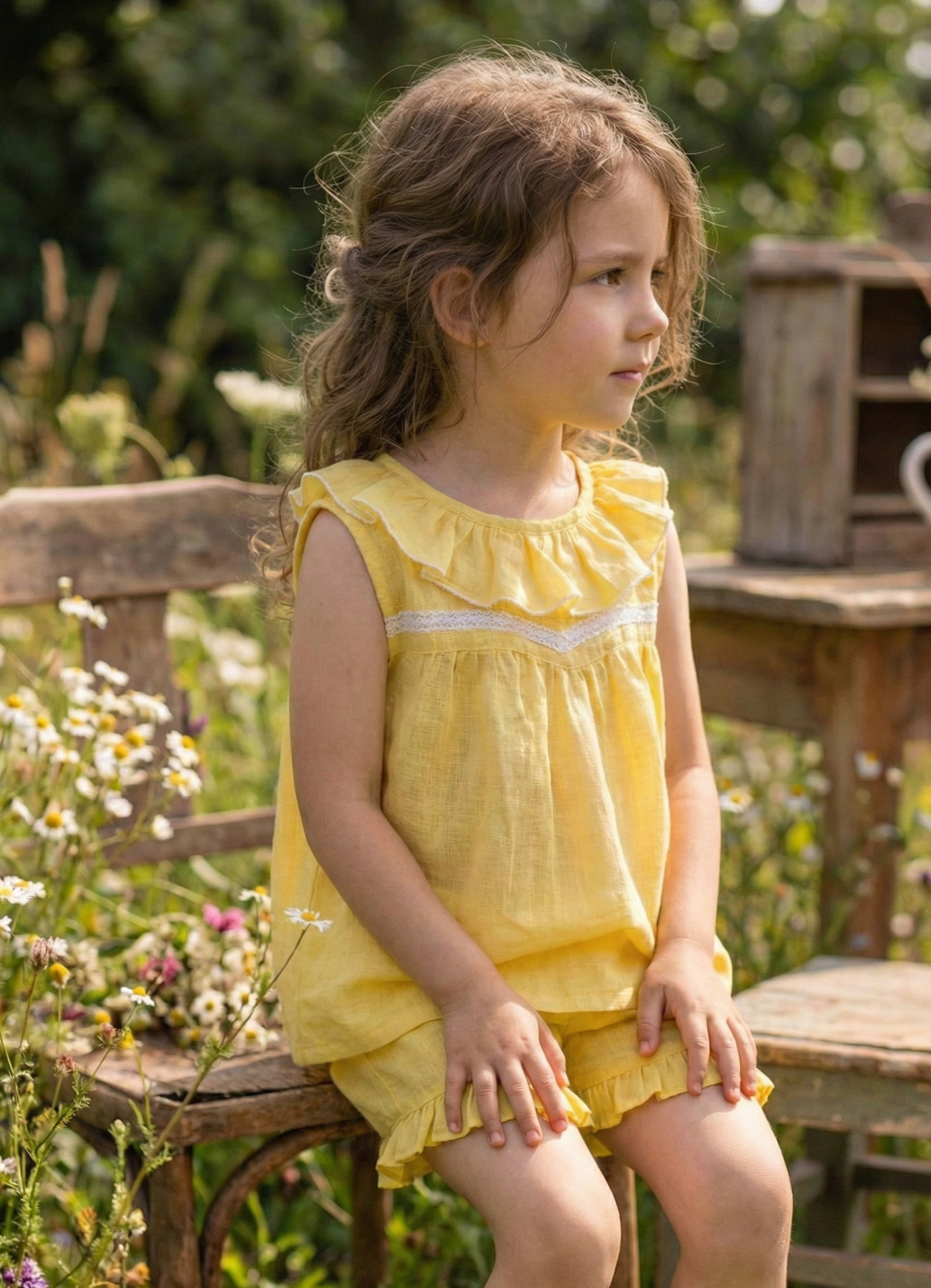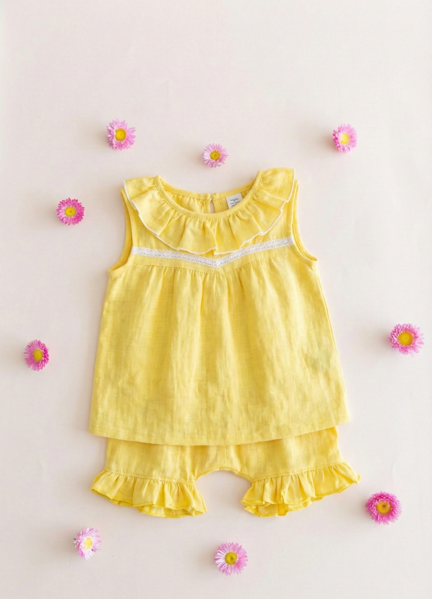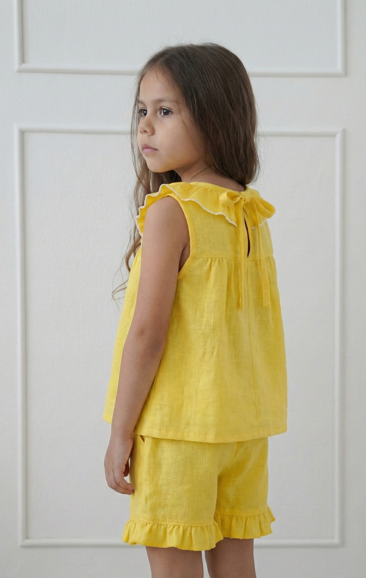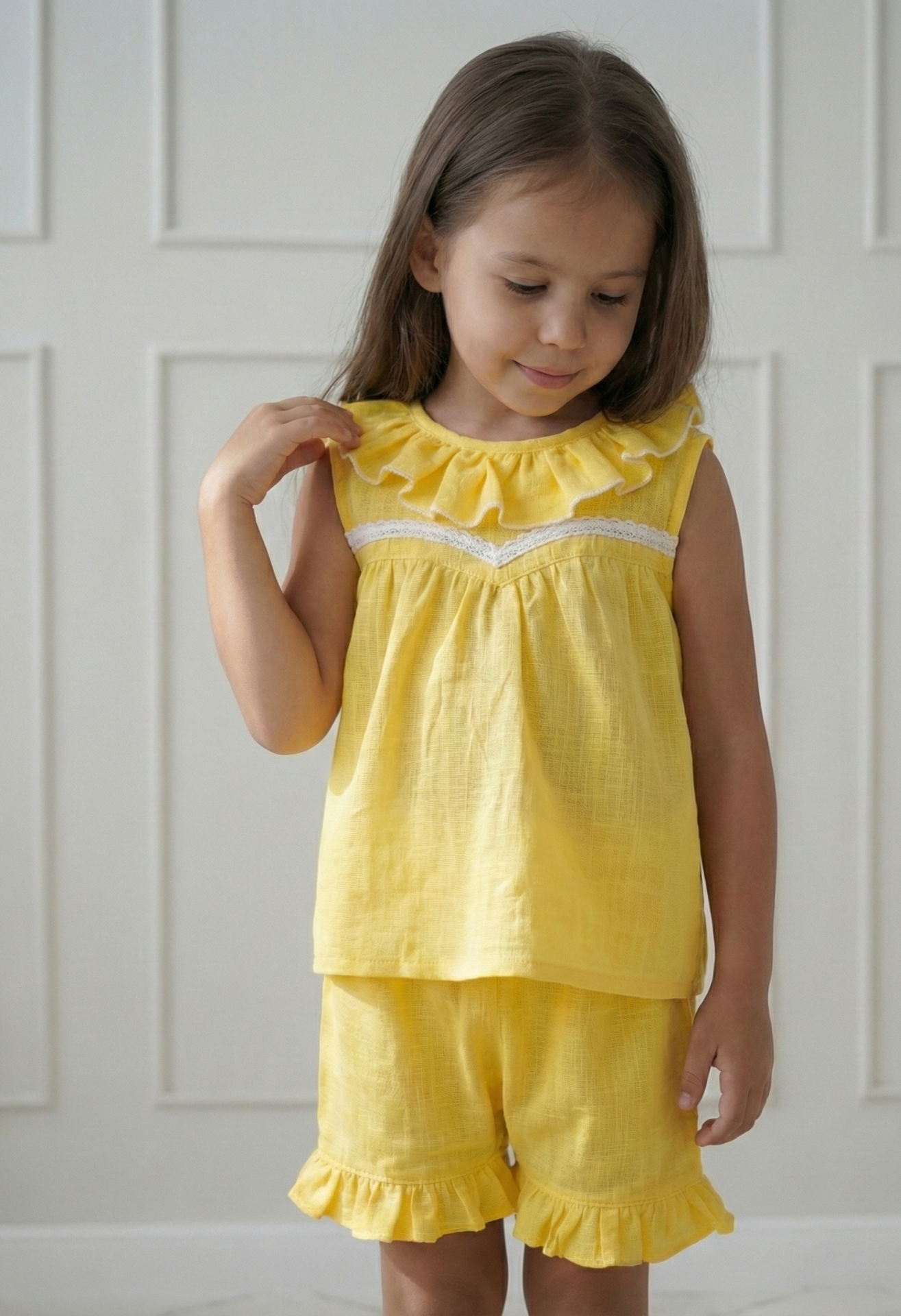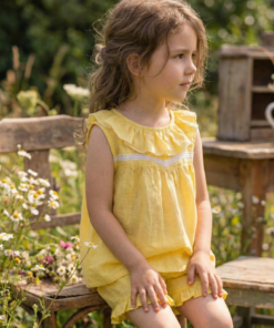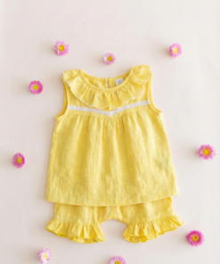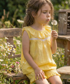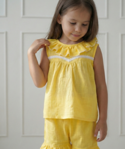 Este conjunto color amarillo vibrante es puro verano. Lo diseñamos pensando en esas mamás que buscan telas diferentes y cortes con personalidad.