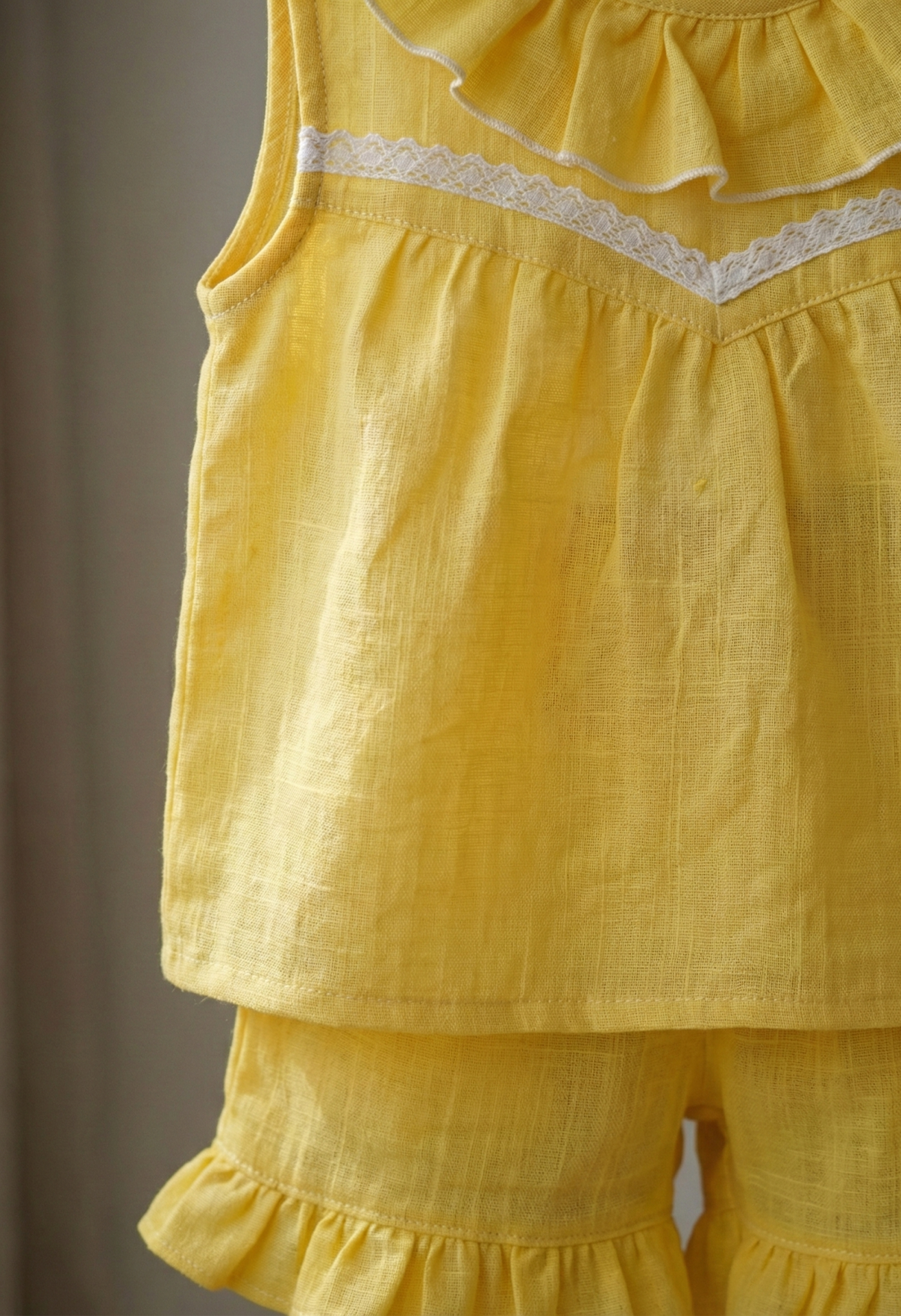 Detalles: Puntillas de algodón, volados en cuello y ruedo.
