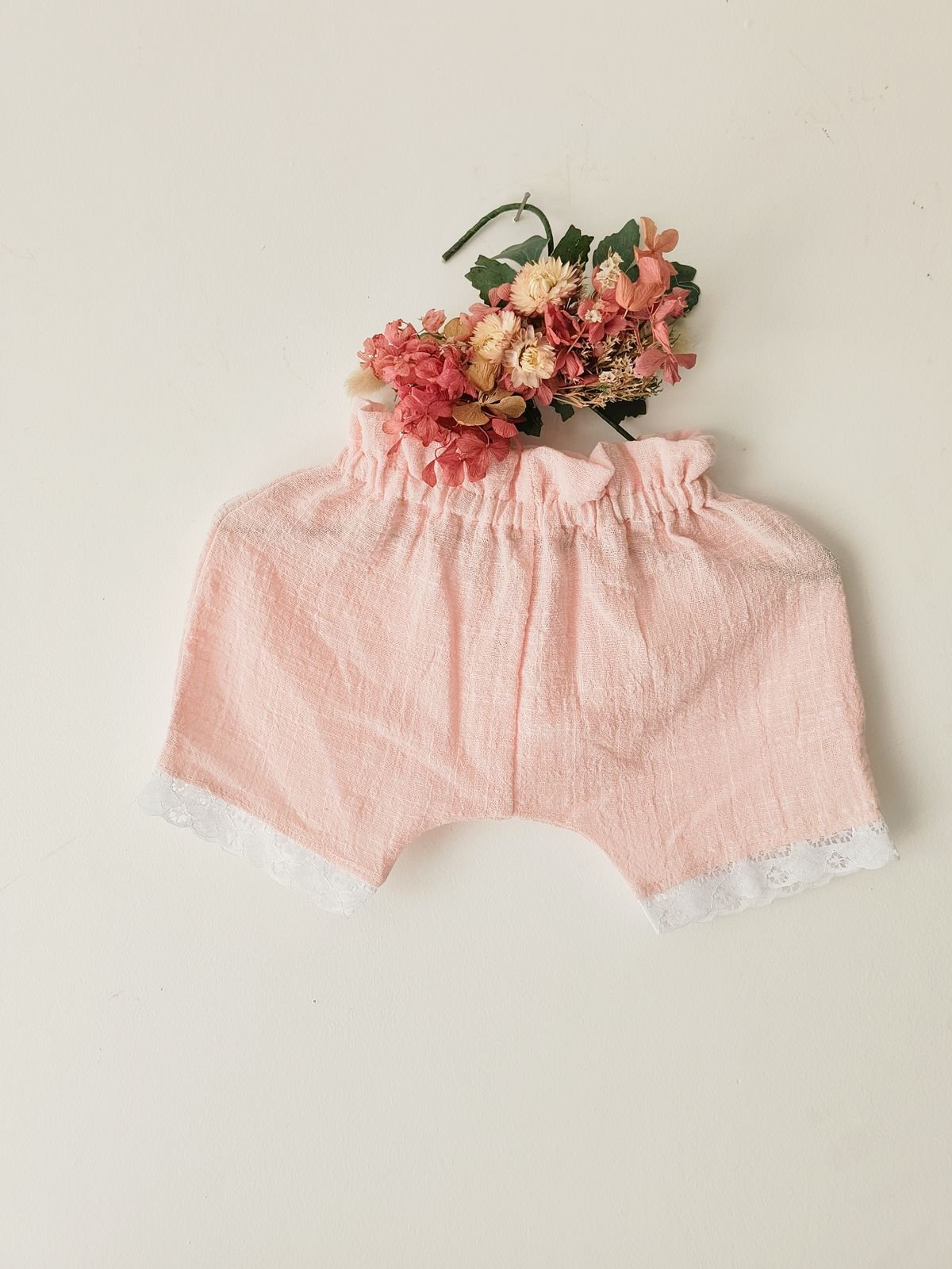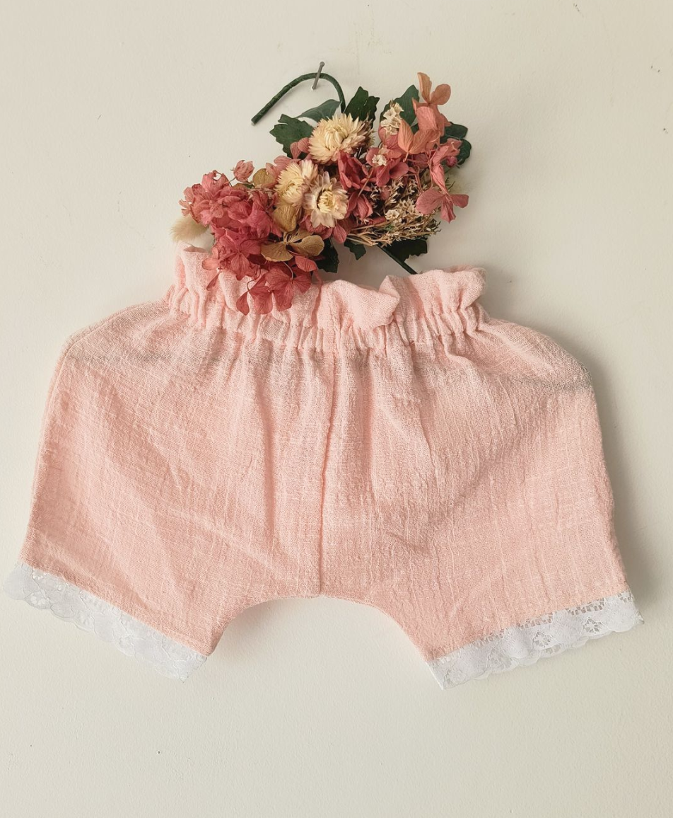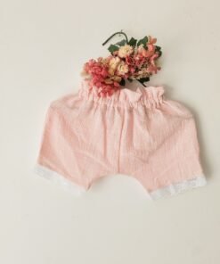Pantalón corto de gasa de algodón rosa con puntilla blanca en el ruedo, ideal para niñas, diseño artesanal y liviano