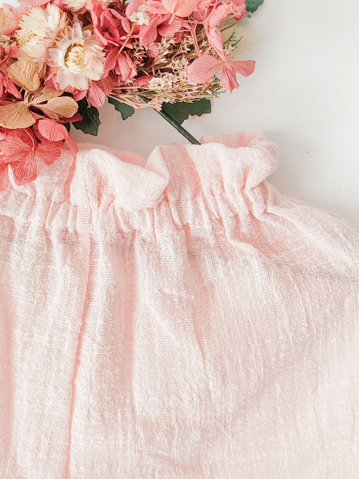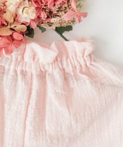 Pantalón corto de gasa rosa con puntilla blanca, fruncido en cintura. Fresco, liviano y con detalle romántico.