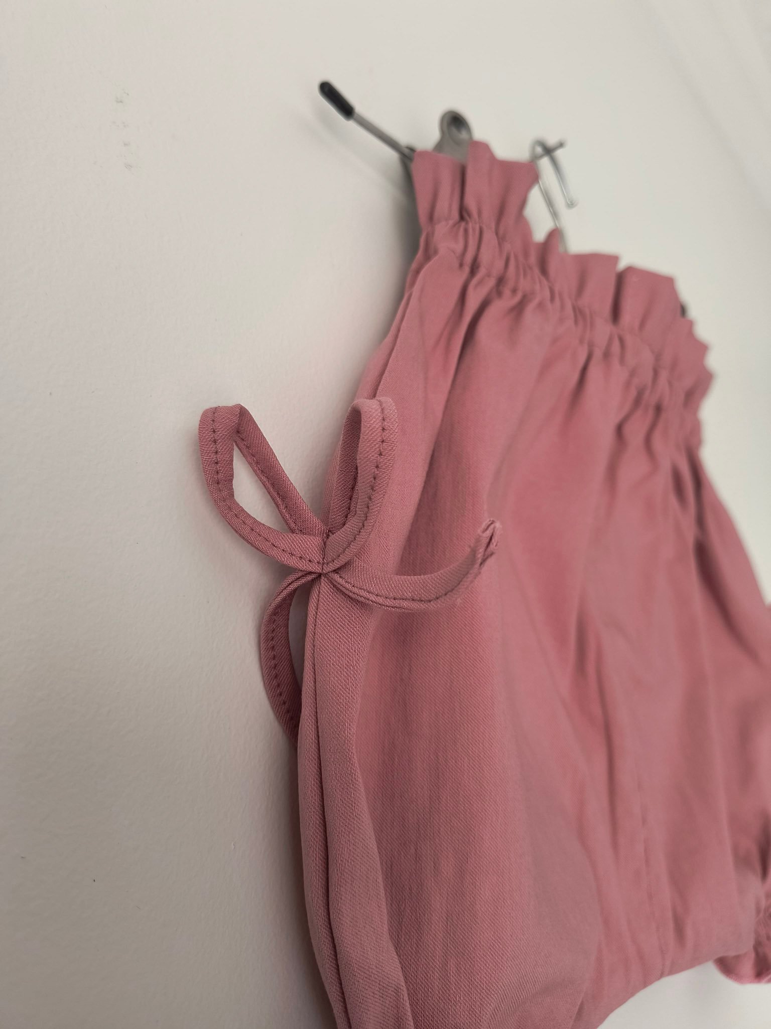 Este Pantalón Romi corto con moños de bengalina en color rosa viejo combina comodidad y estilo. Con un diseño vintage encantador, es ideal para eventos especiales o para dar un toque sofisticado a cualquier outfit. La bengalina, con su suave elasticidad y delicado brillo a la luz, asegura comodidad y movimiento, mientras los detalles decorativos lo hacen único.