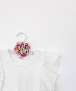 La remera infantil coquette de jersey blanca pastel está pensada para nenas que aman verse delicadas sin perder comodidad. Está confeccionada en jersey de algodón peinado 24/1: es el tejido clásico de las buenas camisetas que tenés en casa, pero en versión peinada, lo que significa fibras más largas y ordenadas. ¿Cómo se siente al tacto? Suave, lisa y liviana, no pica, respira bien y acompaña el movimiento.