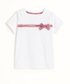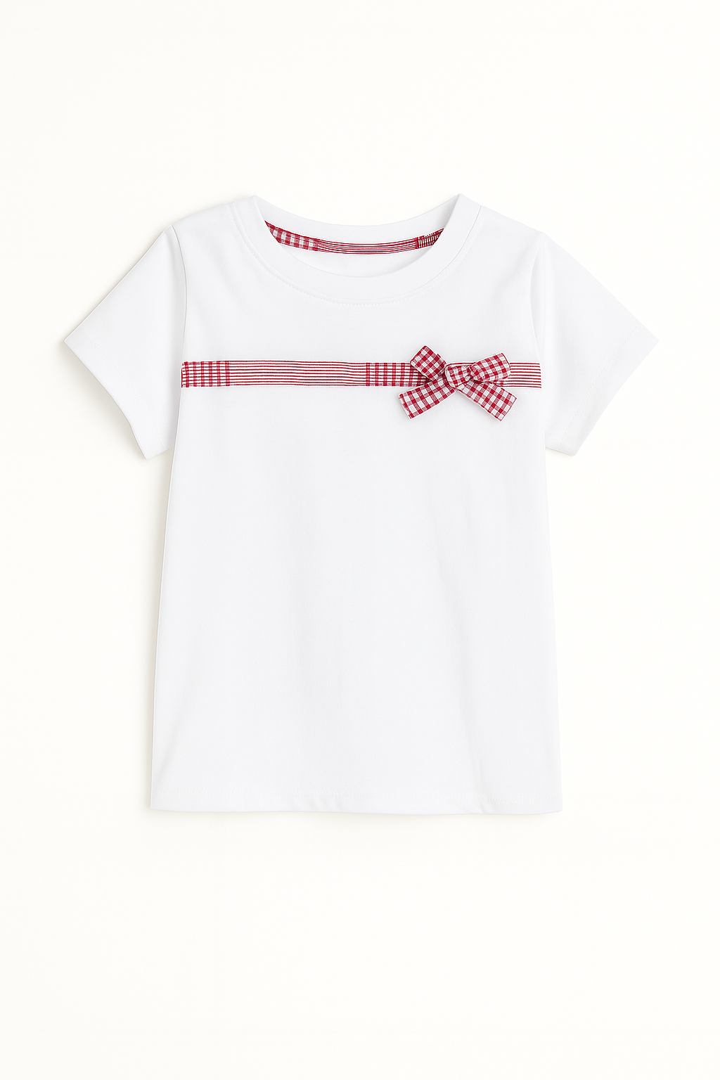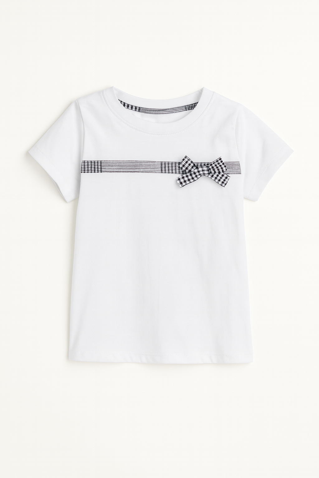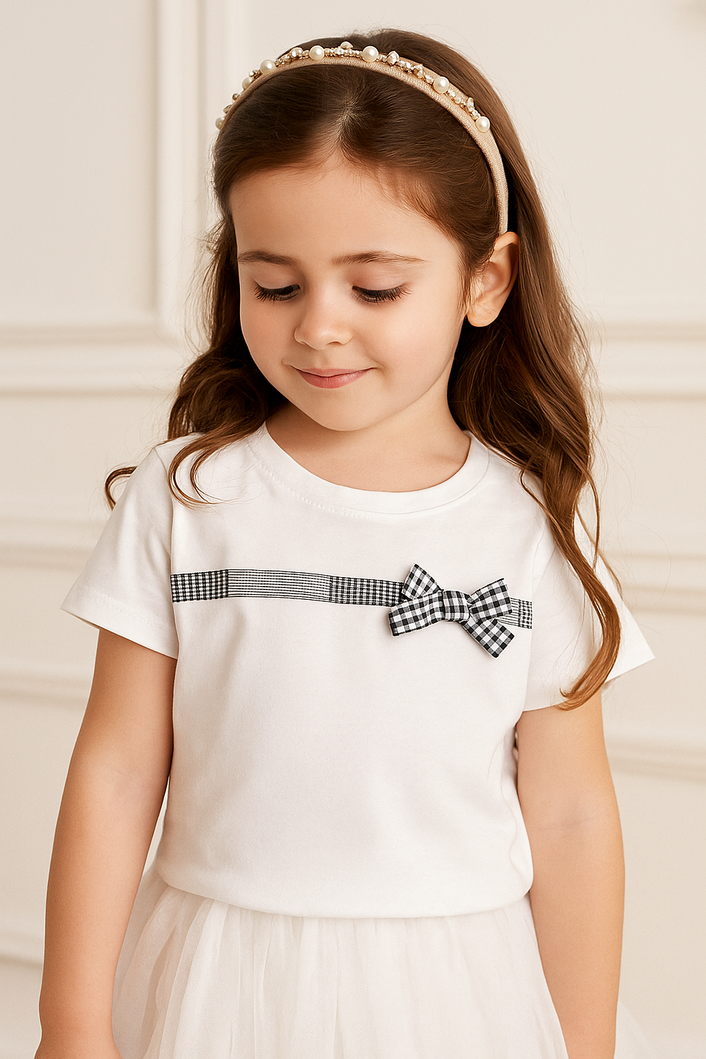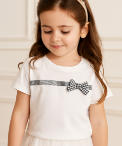 El detalle del moño de cinta cuadrillé en blanco y negro, combinado con la guarda en la misma estampa, aporta un toque coquette que eleva una prenda básica a un estilo boutique. Su diseño de manga corta y cuello redondo la convierte en una opción versátil para cualquier temporada.
