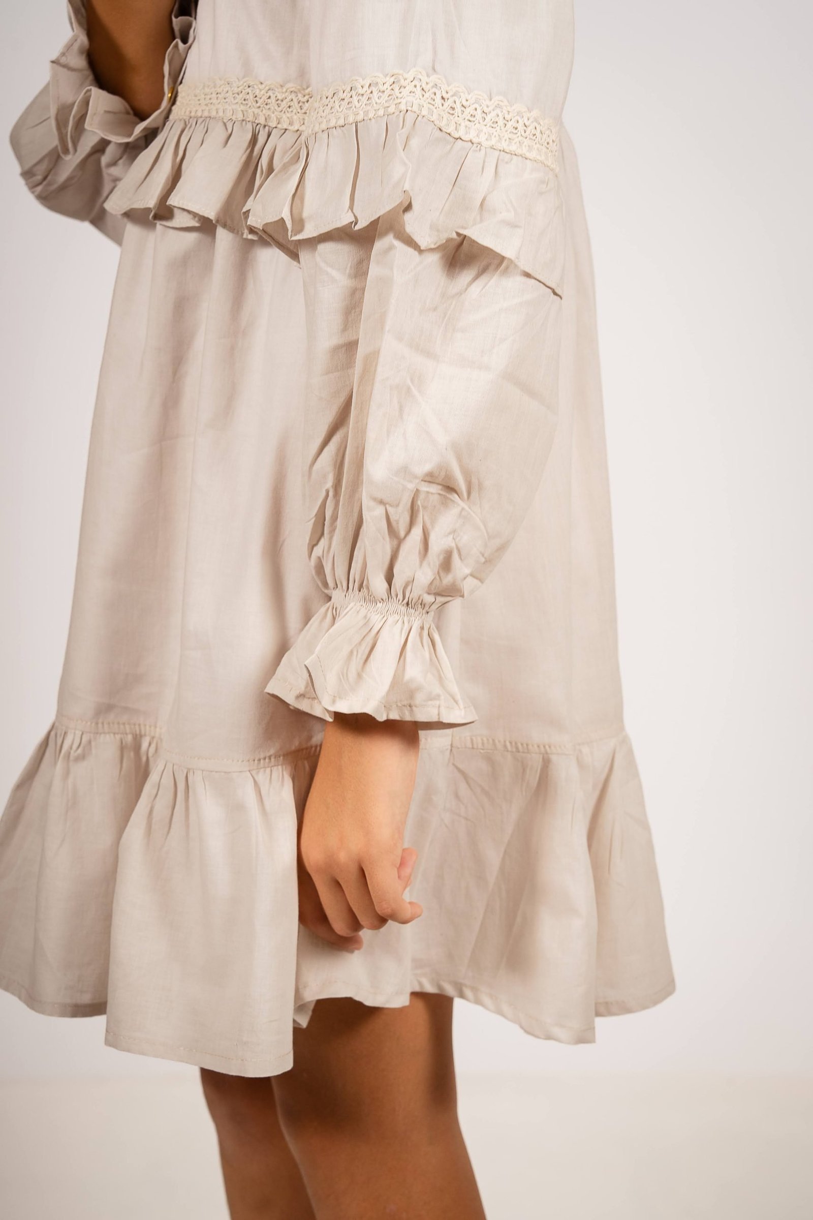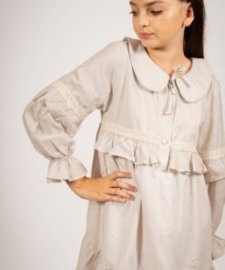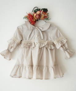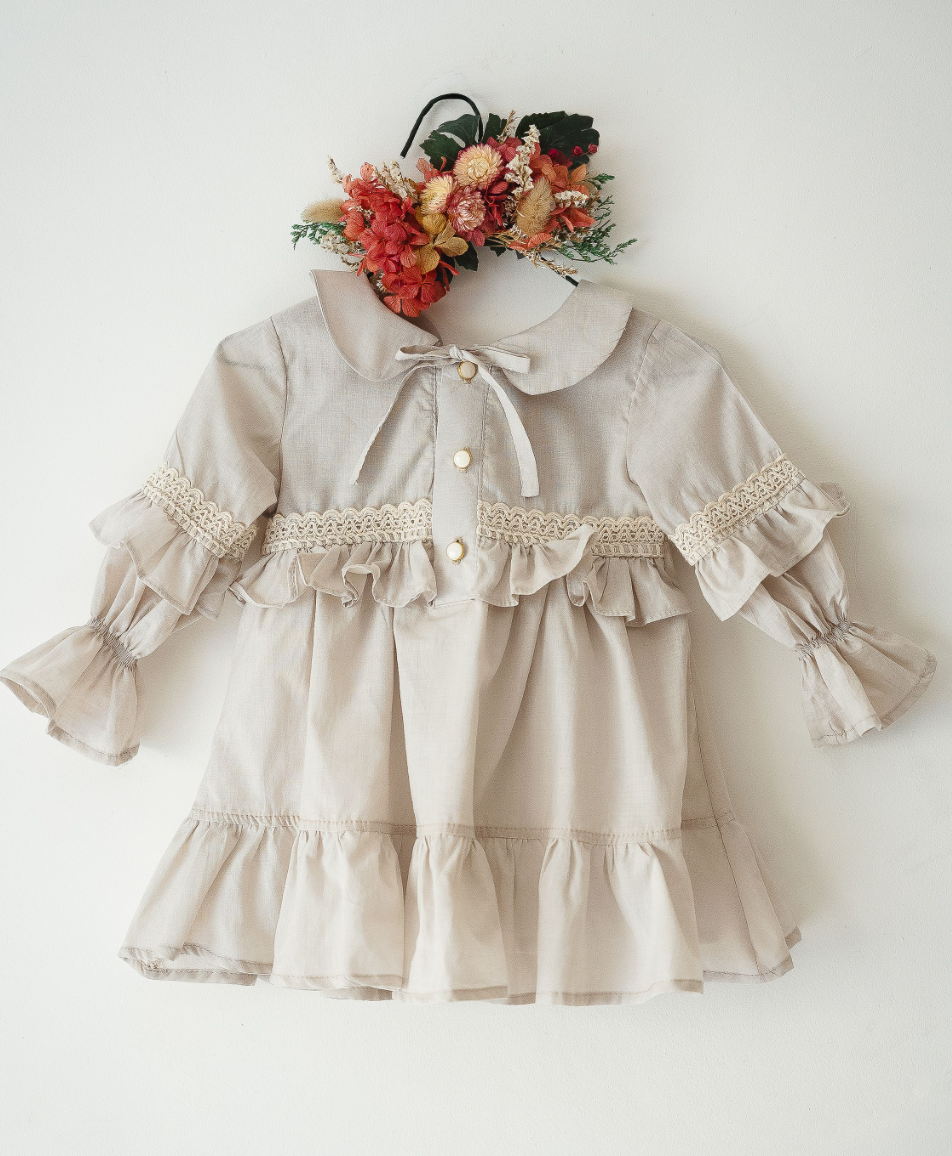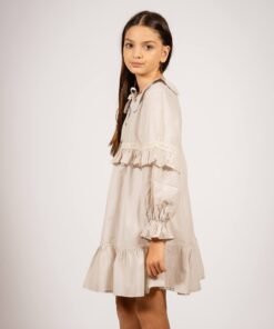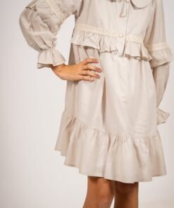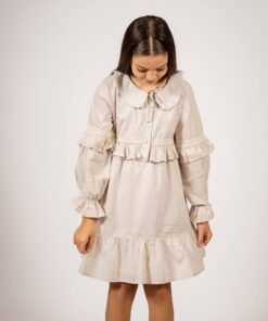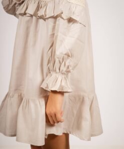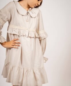 El vestido amelia beige con puntilla es una prenda diseñada para quienes buscan un estilo sofisticado con un toque romántico. Confeccionado en voile 100% algodón y forrado en poplin, este vestido destaca por su suavidad y caída liviana, ideal para todas las estaciones. Su diseño incluye mangas globo con puntillas, un cuello bebé clásico y delicados botones en el frente, acompañados de lazos para un ajuste perfecto.