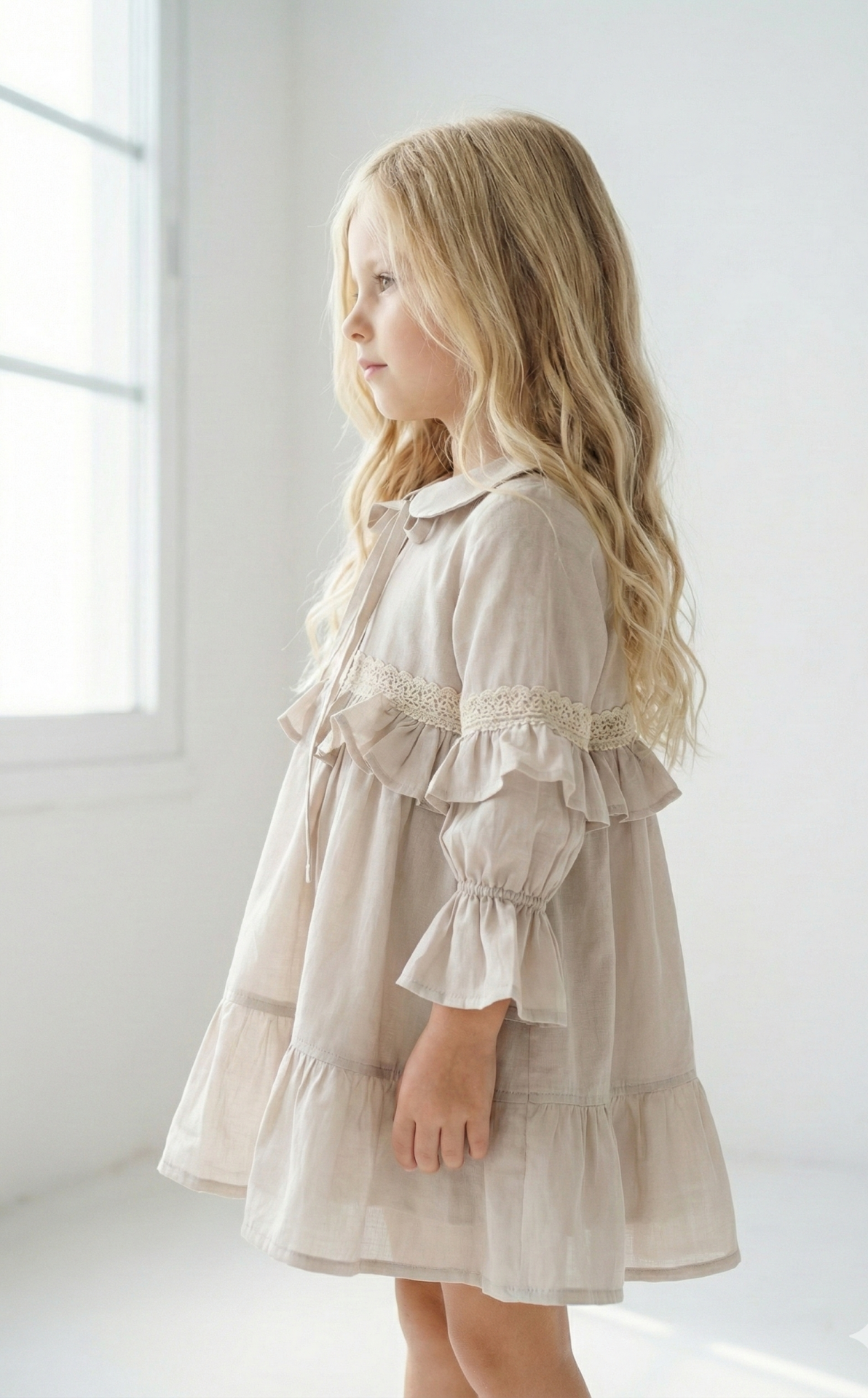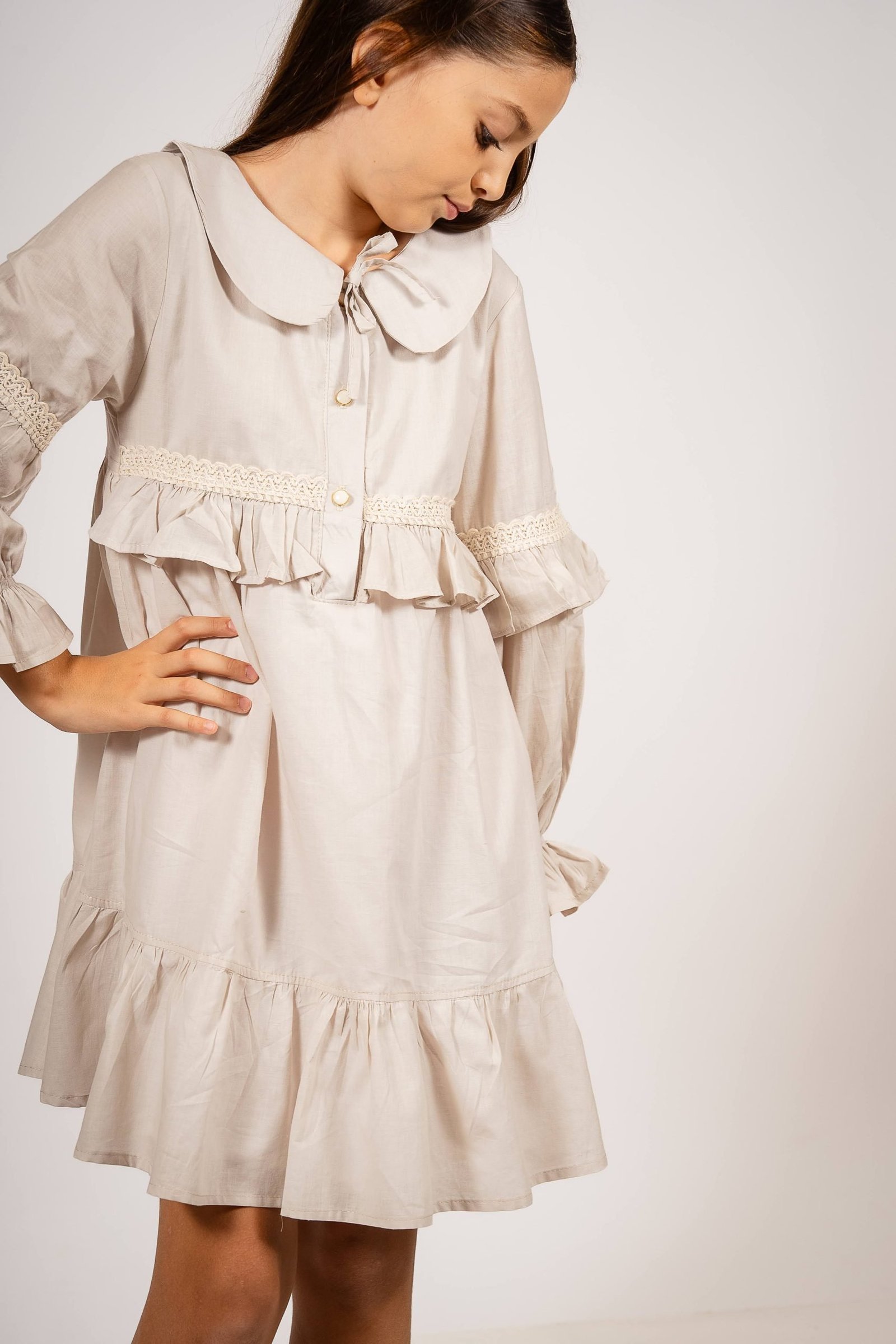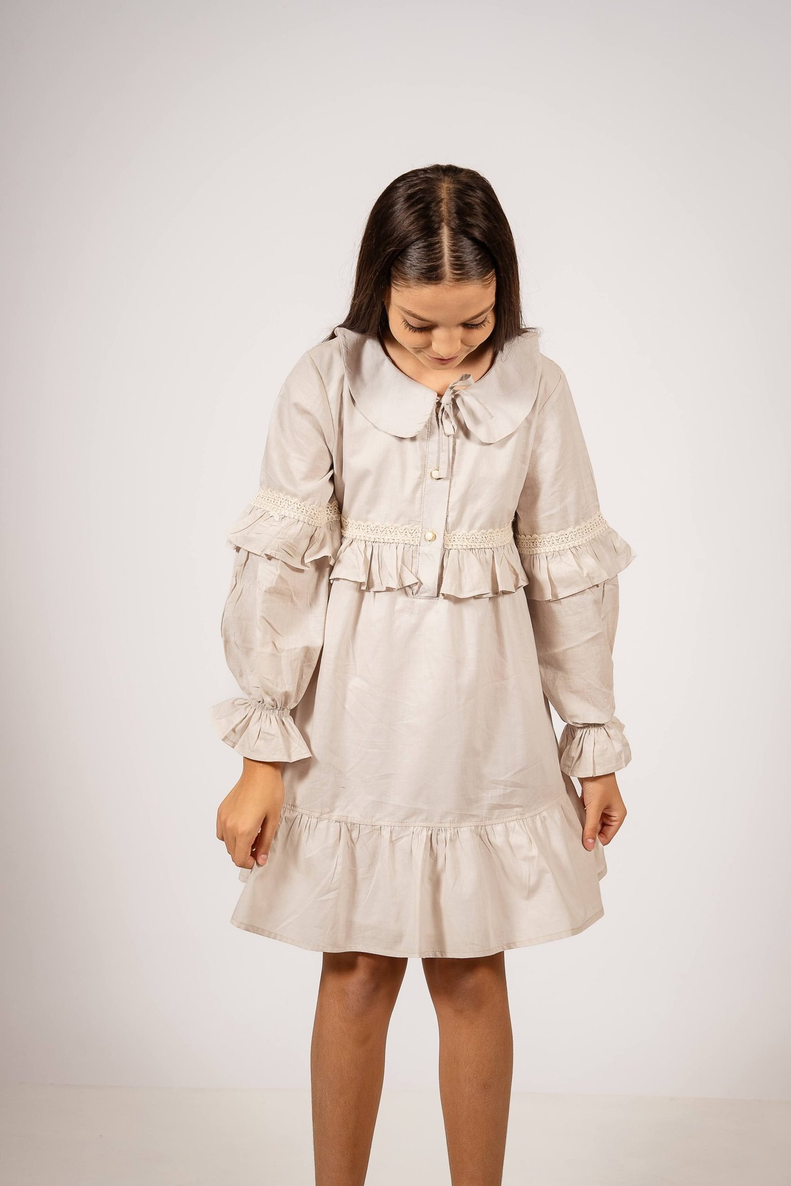 El vestido amelia beige con puntilla es una prenda diseñada para quienes buscan un estilo sofisticado con un toque romántico. Confeccionado en voile 100% algodón y forrado en poplin, este vestido destaca por su suavidad y caída liviana, ideal para todas las estaciones. Su diseño incluye mangas globo con puntillas, un cuello bebé clásico y delicados botones en el frente, acompañados de lazos para un ajuste perfecto.