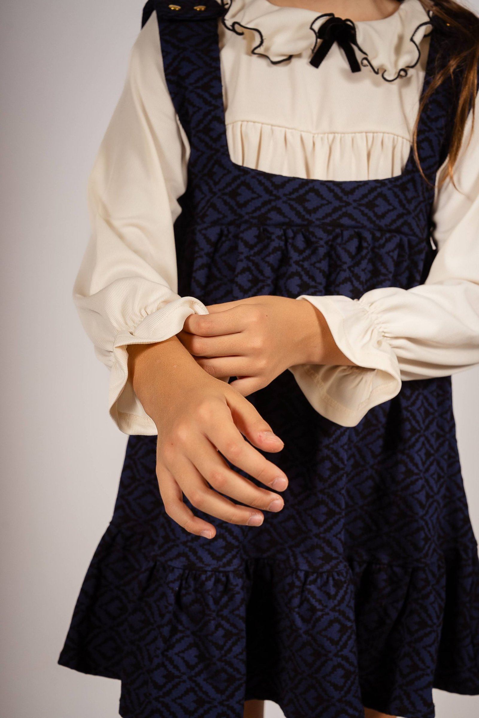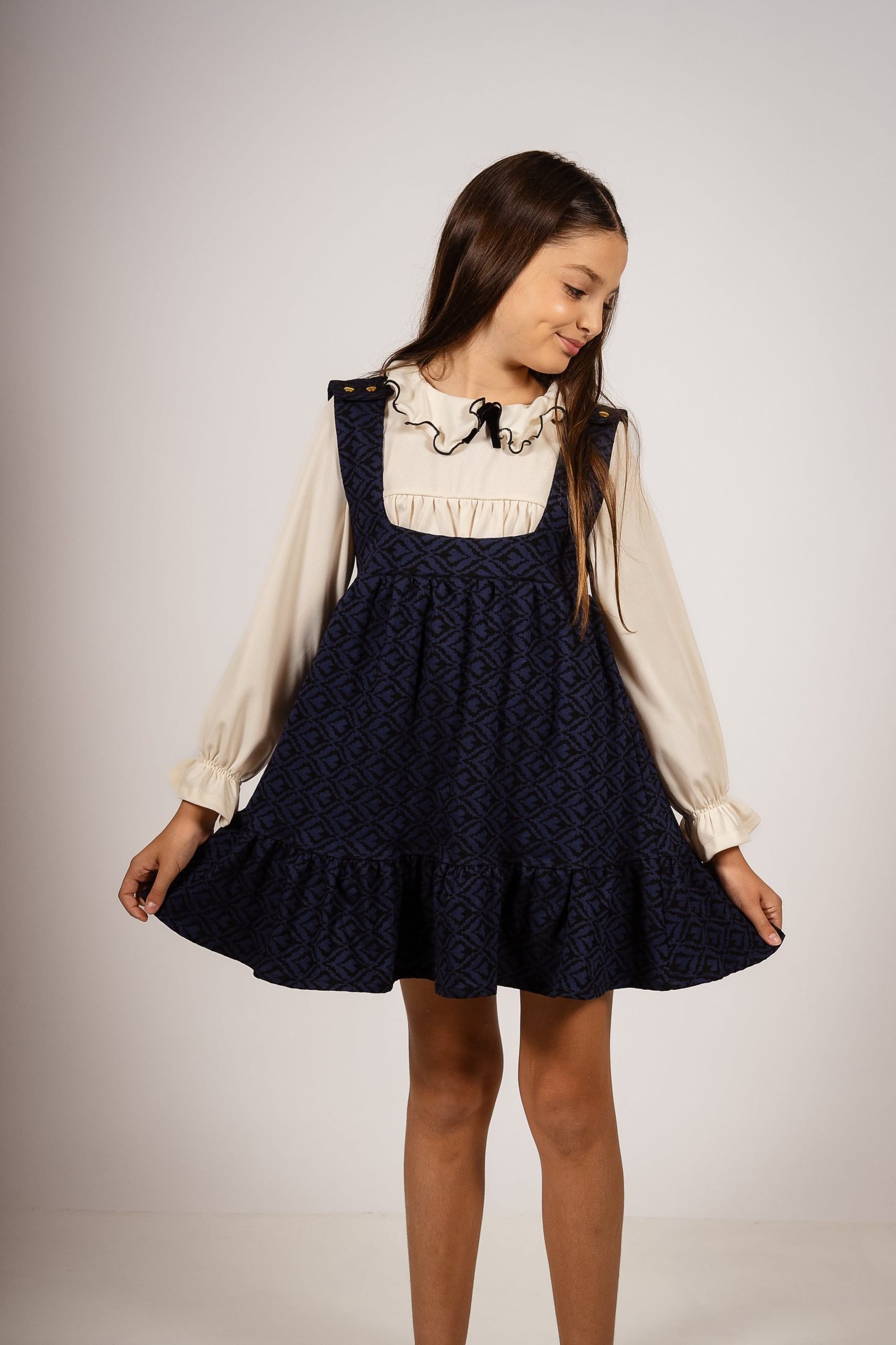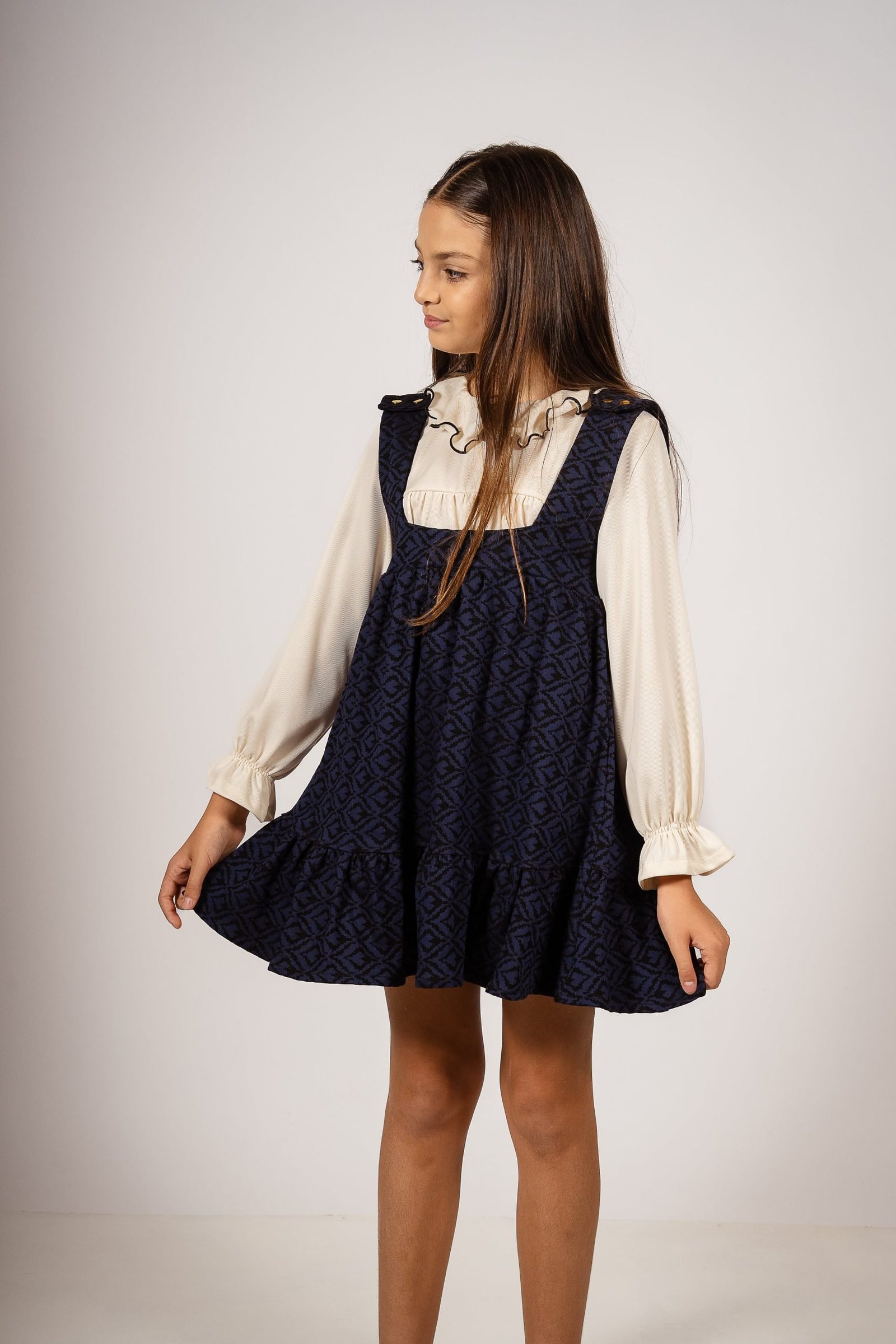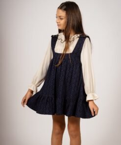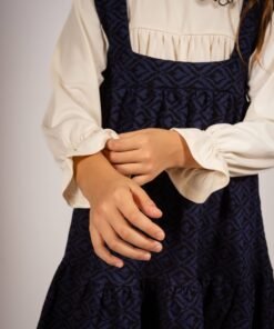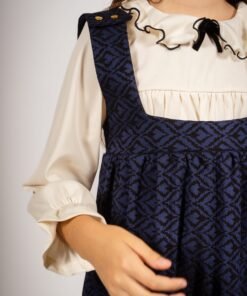 Este vestido jumper de bengalina elastizada gruesa combina lo mejor de dos mundos: la elegancia atemporal de los tejidos vintage y la funcionalidad moderna. Los broches dorados en los hombros añaden un detalle sofisticado, mientras que su estampa vintage única lo convierte en una pieza de coleccionista.»