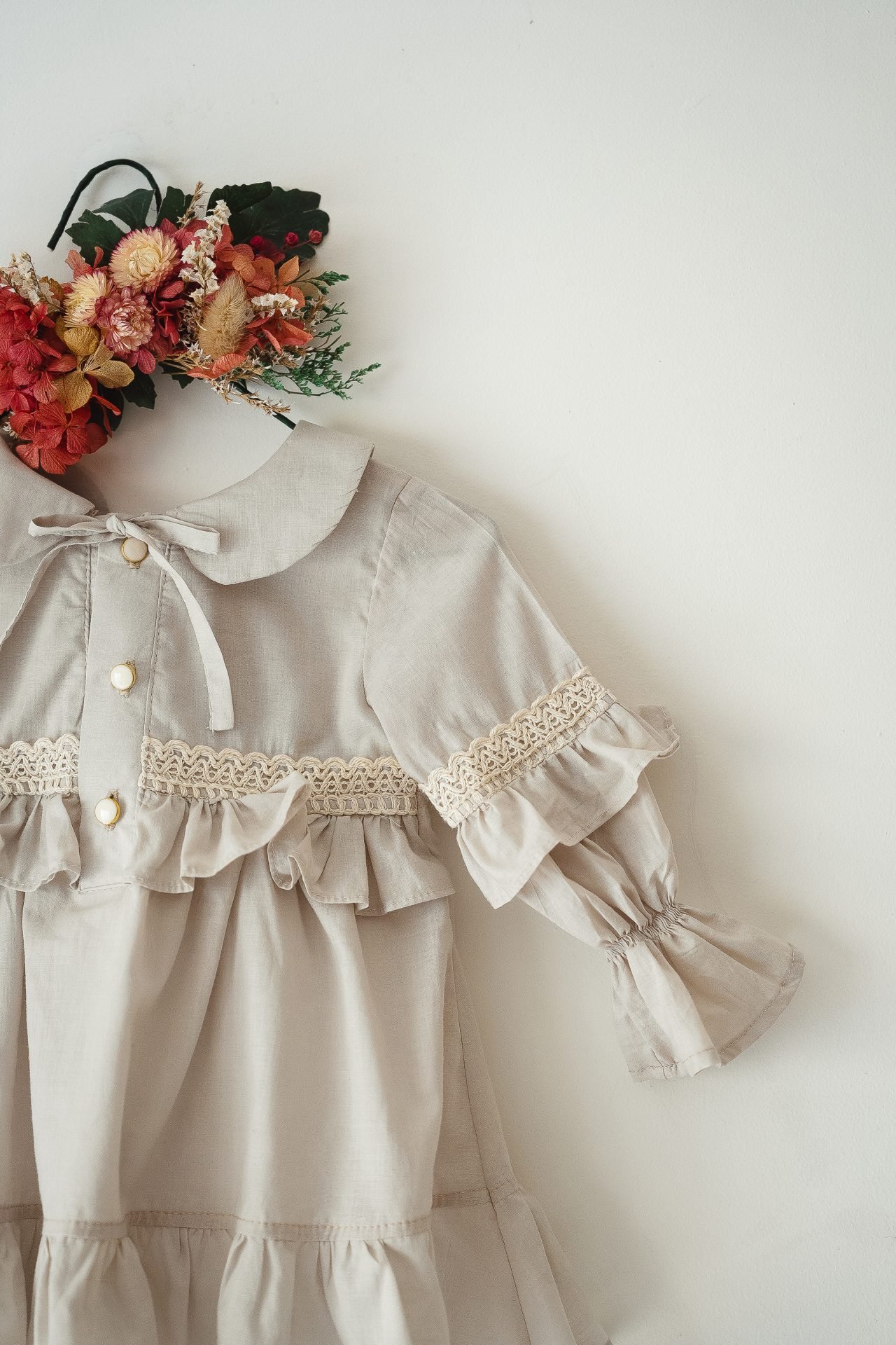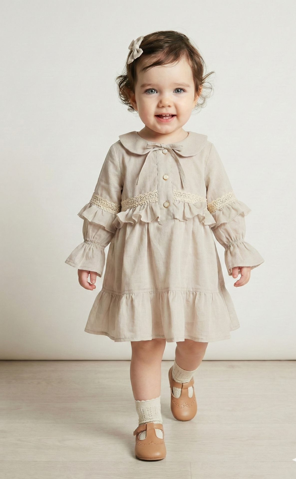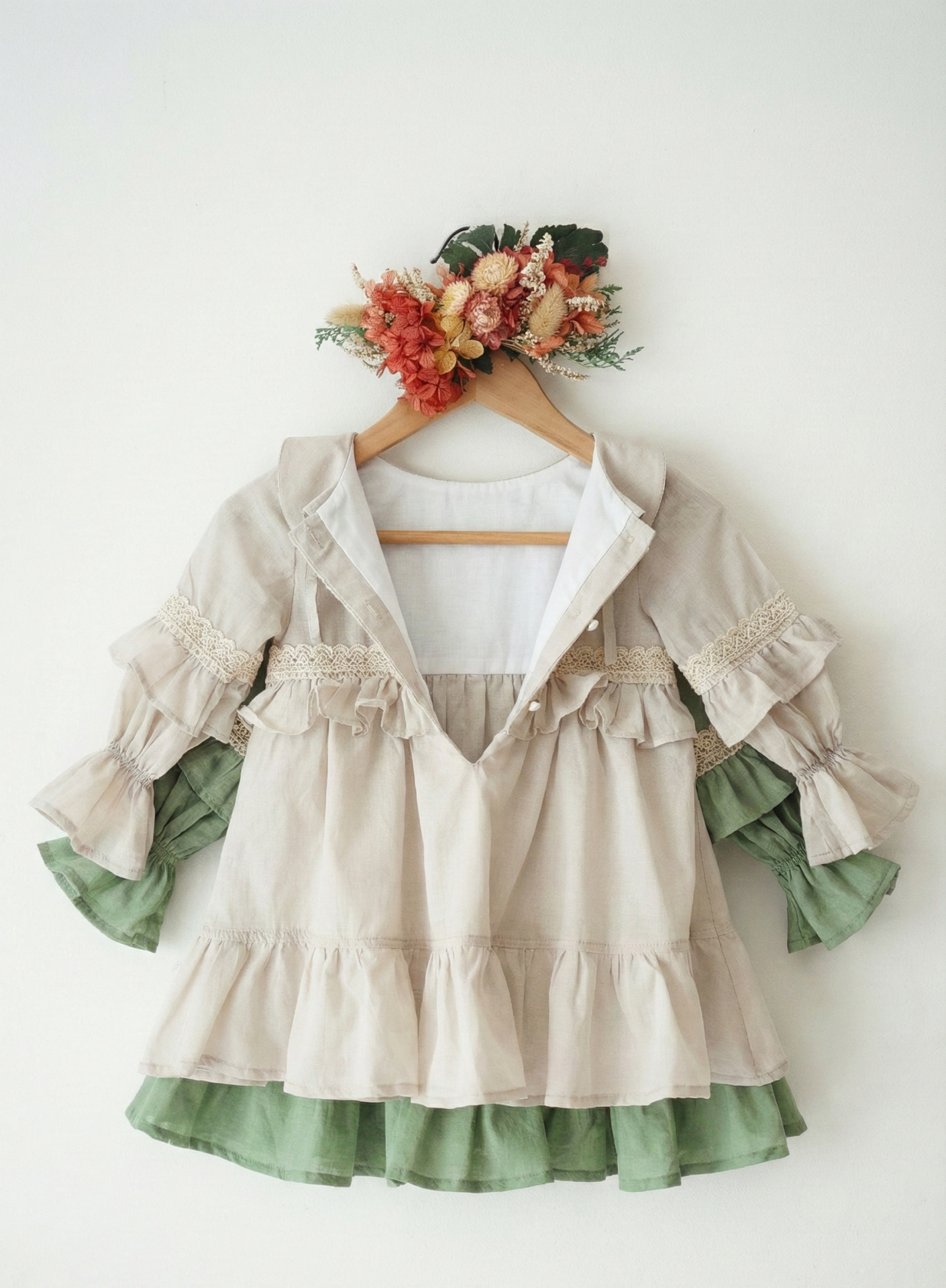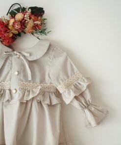 Detalles Artesanales: Cada rincón tiene un detalle: cuello bebé (Peter Pan), pechera con puntillas de algodón, mangas con volados y puños elásticos suaves, y botones que aportan luz.